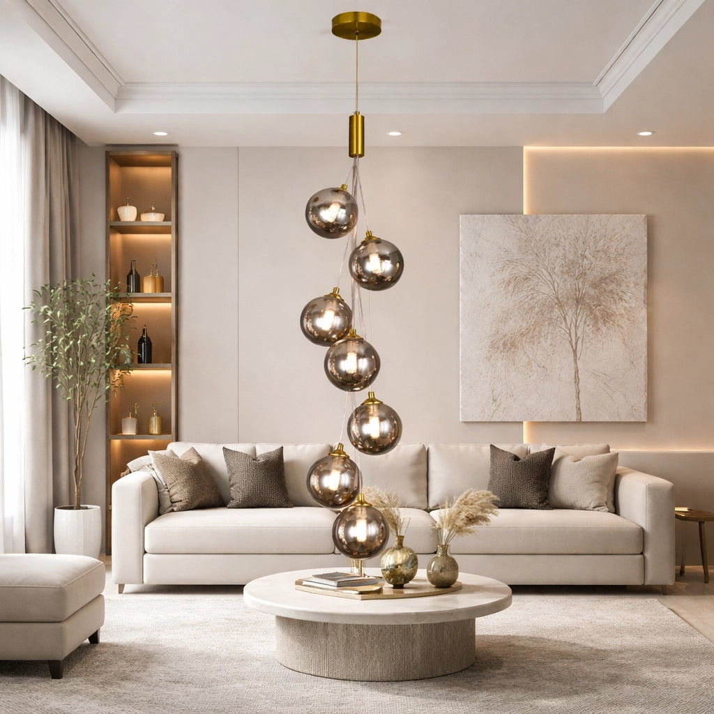 A striking glass ball light with 9 clear pendants in white, amber, or smoke finishes. Features 3-color LED lighting and adjustable height, ideal for staircases, hallways, and modern living spaces.