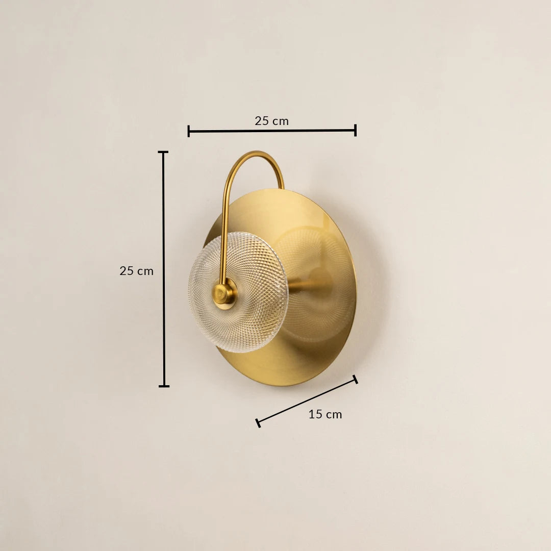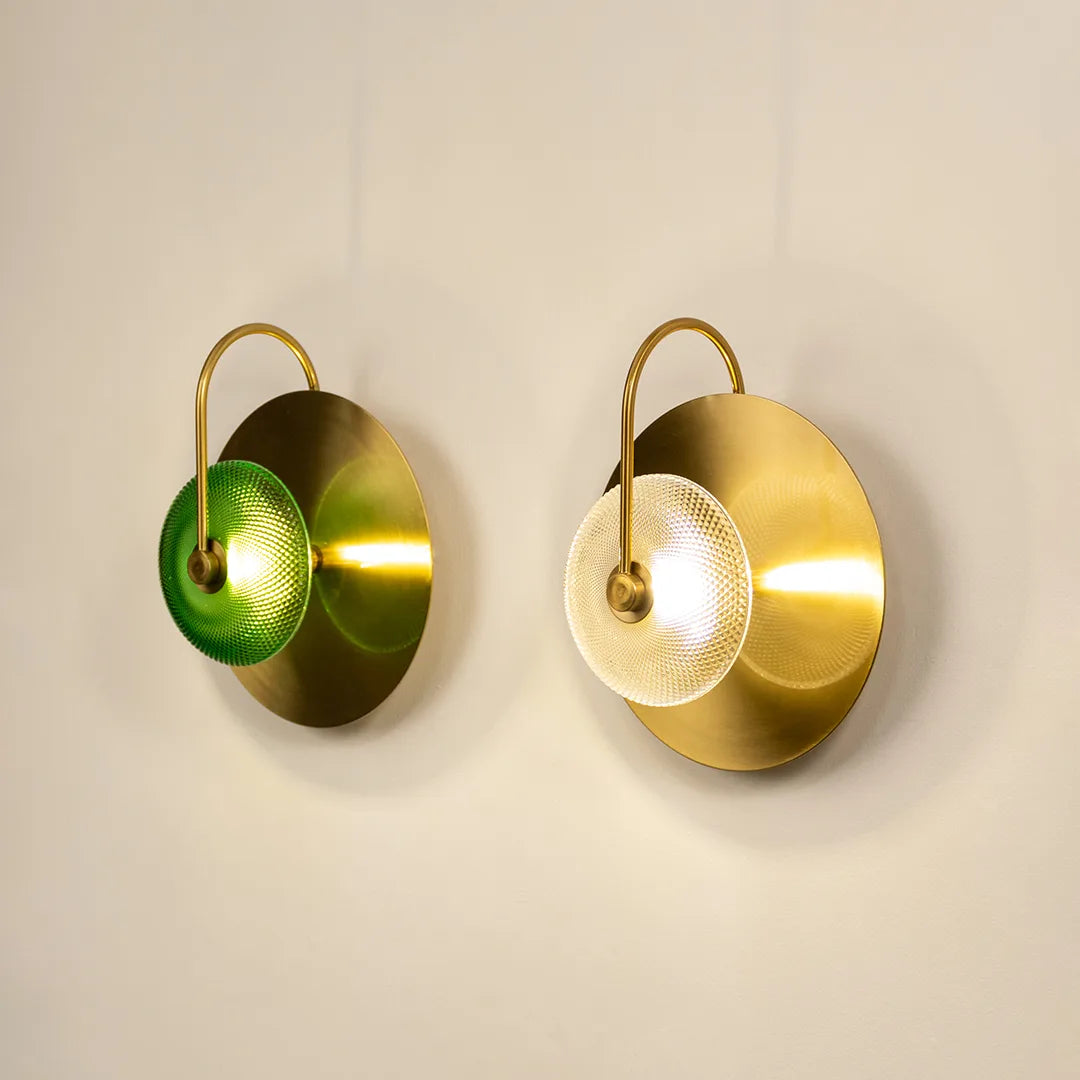 A striking round wall sconce with a modern drum-shaped design and 3-color LED feature. Comes in amber, green, and white glass shades with a luxe gold base—ideal for living rooms, bedrooms, and statement walls.