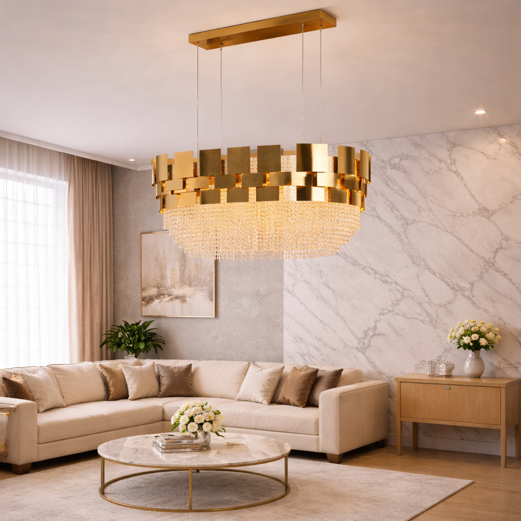 Oval Crystal Chandelier – Gold Finish with LED Crystal Chains